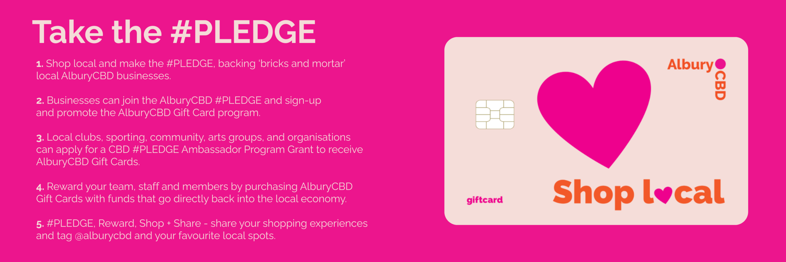 The #PLEDGE campaign is powered by the new AlburyCBD Gift Card program, a state-of-the-art chip card that 100% guarantees an injection of funding into the local economy.